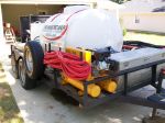 A hose reel is still a distant dream. For now the stakes will do. I have the hose setup to connect directly to the pump. This I dont like. No telling what one hard yank from some yahoo (me or helper) would do. I ran out of poly tubing or I would have ran a 2' length down to edge of trailer with hose connection on end screwed down. I have room on the back rail of my trailer over my delevan for a hose reel. Eventually i can run hose along trailer floor under tool box to pump from reel.