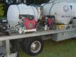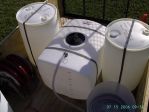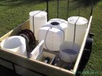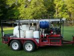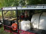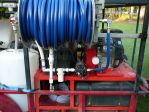 Here is a picture of my first "rig". lol. It has a 30 gallon plastic drum straped to a two wheel dolly, a lawn water booster pump from Lowe's, two garden hoses, two ladders, an extension cord, and a 7 selection spray nozzle.... don't worry, I was on the phone w/ Lori yesterday and plan to purchase 'real' equipment next week.