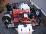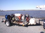 In the open trailer I have two hose reals one for high pressure and one for mix, one 25 horse kohler 10 gallon minute cold water pressure washer, one hot water burner, one generator, one air compressor, one All-Flo pump, one 125 gallon water tank, and three 35 gallon chemical tanks, and of course more ladders than I know what to do with.
