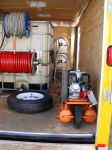 Way to notice the details guys! Yes, our customer purchased the trailer with the plywood floor. He has another trailer on order with pressure treated flooring. The customer wanted to use a tote for the water tank. My Father fabricated three diamond plated mounts to install the hose reels on the tote. We ran into a space issue.