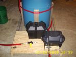 Using a 5850 Delavan pump, 5/8 Kuri-tech hose, (bought from Lori at PWP) and made our own manifold and valve system. Made our own nozzles with info we found here. The manifold is a simple design which allows us to transer SH to the barell, or draw chemical from another container as well as draw clean water for pump rinsing.