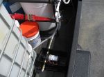 Here are a few pics of the plumbing setup. I had originally placed the pump in a battery box and later removed it for better access to it. I ended up making a plate attached to the pump that easily hangs over the side rail of the trailer ( sort of like how a ladder jack works) easy on easy off. The small length of coiled up hose is to easily transfer the SH to the mix tank and instead of switching the 55gal drums of SH, I keep the same blue drum in the trailer with the SH label and transfer fresh SH into that drum. My plumbing is set up to easily add SH and water from their respective tanks to the mix tanks with a few turns of ball valves. A note on the ball valves - I will try out the Banjo Brand valves this season due to the valve handles breaking on the PVC, I hear the Banjo brand move more freely.