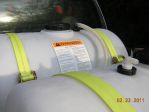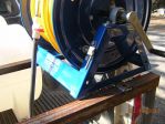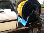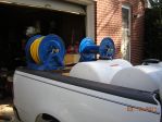Had some time today, and broke down the setup for prep and paint. As you can see in the pic below, there are only 3 simple pcs. to this setup, and a handful of hardware in the yellow bin. I had it broke down and out of my truck in 10 min. (tanks are empty and there is no plumbing as of yet). I used a sanding wheel to clean up all the steel items and cleaned with Evapo-rust (Great stuff) as a preventive measure. Then applied the bed liner coating to all the steel parts. I am letting parts dry over night and will reassemble tomorrow afternoon. I set the hose reels the way I did so if I pull up in front of a customers home I can pull my yellow chem hose easily. The other 3/4 hose can be brought over the other hose reel as a guide and pull easily as well. Same concept applies if I pull in a driveway. I do not think the reels mounted to pull from the back are very user friendly, at least not the way I work.