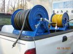 OK got some time today to work on the truck mount. I bought the red EDPM 3/4" hose to plumb everything in with. I bought a paintable bed liner from Tractor supply for $45 as opposed to the $99 Herculiner from Auto-zone. When I have everything fabbed up I will cover all the steel components with the paintable bed-liner. I will use the orange rubber pieces that I have to isolate the plastic tanks from the steel to avoid any abrasion and damage to the tanks. I still have to mount the battery, and pumps and plumb everything. If the rain holds out I will have it done tomorrow. I will disassemble, paint all the steel components with the bedliner, and reassemble on Sun. New Hose reel is loaded with 200' of 3/4" hose Chris
