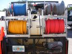 4 Full Frame, Stacked Titan Hose Reels: Models TT43XX and TT43XX with a stainless manifold and a TT4022 or 28 (1" manifold for the garden hose), 2 x stainless steel stack kits with 3/8" Blue and (old) Grey Non-Marking High Pressure 2 Wire or R2 Hose with a 3/8" Ball Valve (6292) and Mosmatic Inline Gun Swivel on each set of Hoses (Street 45's composed of Steel and Brass were installed after the picture was taken to allow the hoses to lay flat against the spools), 5/8" Yellow Ag hose for use with the All-Flo Air Diaphragm pump as a soft wash or roof wash application hose with brass fitting crimped on to the ends using one of our hydraulic crimpers (Crimped Ends mean that there are NO HOSE CLAMPS to watch out for!!!), a 1/2" Poly 90 Degree Hose Reel Swivel Upgrade for the chemical reel that resists corrosion, a length of 3/4" ID Kuri Tec Garden Hose plumbed to the tank using a 1"HIGH Temp Hudson Float Valve, 1" Poly Bulkhead, and Hudson Inlet Assembly usually assembled using SCH 40 or SCH 80 PVC fittings(Polypropylene fittings are too soft and will fracture under stress and especially in this location), high pressure custom cut, crimped and installed jump hoses using the 1/2" MPT ferrules and a 3/4" ID Yellow Ag hose to supply to All-Flo is attached to the bottom left reel.