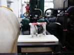 All-Flo Air Diaphrgam Pump: AFKE038B3 Kynar AODD Pump with a 5 YEAR WARRANTY, an Integral Filter/Regulator set to 90 psi on a short custom made air hose and qc set, Kynar hose barbs threaded into the suction side of the pump (We used barbed elbows here...not usually recommended because elbow slow the flow), 3/4" Yellow Ag Suction/Supply hose attached to a PVC slotted filter, SCH 80 PVC Hose barbs, a 3/4" 3-Way Ball Valve with SS Mounts to allow operator to switch tanks to rinse or use different chemical, 2 x 3/4" Poly Bolted Ball Valves sitting on 2 x Custom Made 'decks' (white and green) on top of the chemical tank(s).