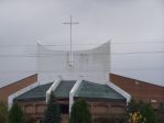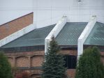 The back of this church has a metal roof backing up to the huge wall with the cross. It has algae as well.